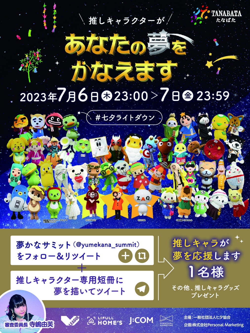 期間中、キャラクター専用の「Twitter短冊」に夢を投稿した方の中から、審査の上、「夢かな賞」を1名様に授与します。審査委員長を務めるのは、ゆるキャラ大好きアイドルの寺嶋由芙さんです。